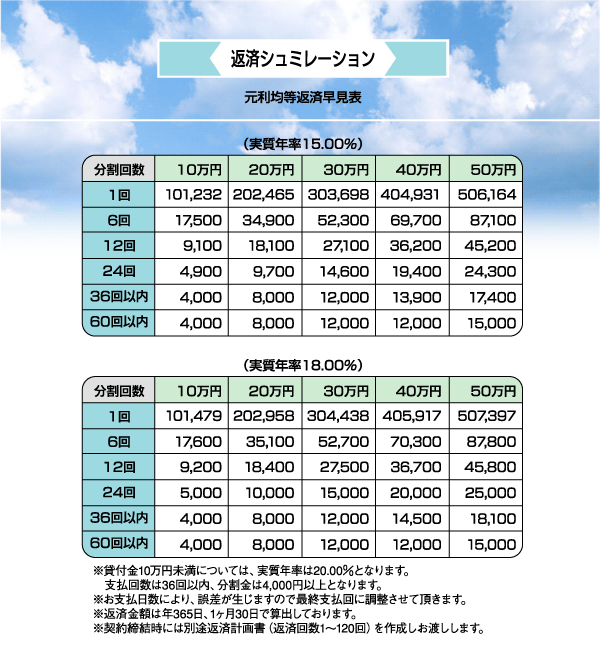 ※貸付金10万円未満については、実質年率は20.00%となります。支払い回数は36回以内、分割金は4,000円以上となります。